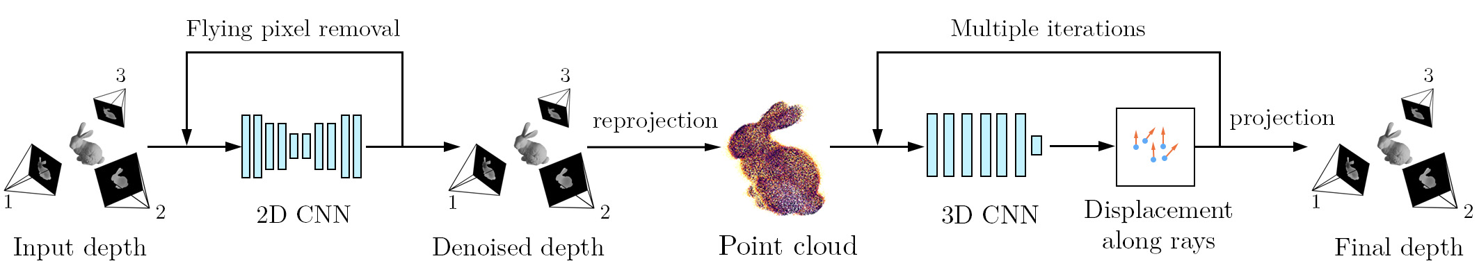 The core contribution of this work is to process multiview depth data first as a set of 2D images, then as a joint 3D point cloud. In our workflow, noisy depth images are first processed indpenedently by a 2D convolution neural network trained on single camera depth noise removal. After this step, the point clouds from indpendent cameras will not match perfectly, as they were processed separately. To remedy this, the joint point cloud is then processed by a 3D neural network trained to solve this type of inconsistencies. The points are only allowed to be shifted along the rays defined by the optics of each depth camera, which allows the final joint point cloud to be reprojected to each depth camera without any loss of information.